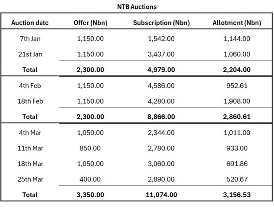 In Q1 2026 the Nigerian Treasury Bills market was characterized by a bullish bias, supported by strong system liquidity and sustained appetite for the primary market. This was evident by the persistent oversubscription at the Primary Market Auctions (PMAs) throughout the quarter, particularly on the long-dated papers. After the Monetary Policy Committee (MPC) meeting, which resulted in the MPR being cut by 50bps to 26.50%. Demand was skewed heavily towards the long-dated maturities, as investors sought to lock in attractive yields. The 4 March auction was oversubscribed at N2.34trn against the N1.05trn on offer, while the 364-day stop rate rose to 16.73% (c.83bps above the previous auction). By the 25 March auction, demand was still robust, with N2.89trn subscription met by a total sales of N520.67bn, underscoring continued interest at the long end of the curve, despite the decline in stop rated.