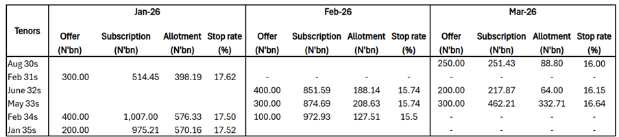 The bond market in Q1 2026 reflected an evolving interplay between liquidity conditions, policy direction, and investor positioning. January opened on a mixed note, with early demand supported by softer-than-expected inflation data, which drove selective buying across short- to mid-term maturities. However, sentiment turned cautious mid-month as the market adjusted to incoming supply, leading to some upward pressure on yields, particularly at the belly of the curve. Activity remained mild toward the month-end, with demand re-emerging in select tenors. At the primary market auction, the Debt Management Office (“ DMO”) offered ₦900bn but allotted ₦1.5tn across the 2031s, 2034s, and 2035s, clearing at 17.62%, 17.50%, and 17.52%, respectively, reflecting solid demand at relatively elevated yield levels.