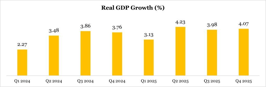 Nigeria’s economy gained further traction in the fourth quarter of 2025, with real GDP expanding by 4.07% year-on-year, marginally higher than the 3.98% recorded in Q3 2025 and above the 3.76% achieved in the corresponding quarter of 2024. As a result, full-year 2025 growth accelerated to 3.87%, compared with 3.38% in 2024.