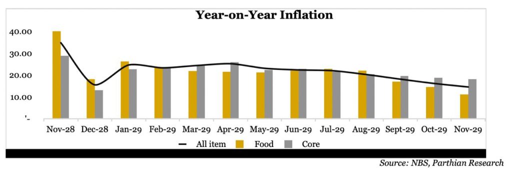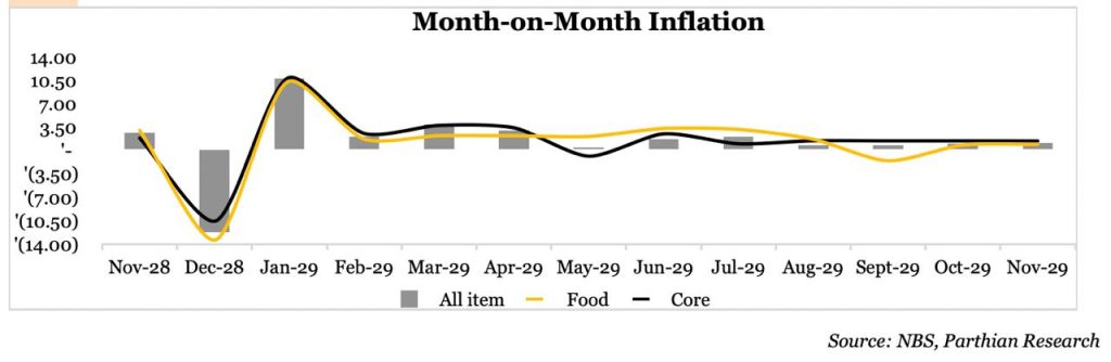 On a year-on-year basis, the core index declined marginally to 18.04% from 18.69% in October. On a month-on-month basis, core inflation slowed to 1.28% in November from 1.42% in October. This was partly supported by a relatively stable foreign exchange environment.